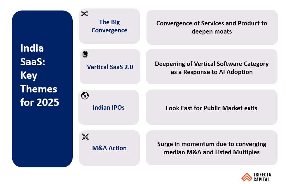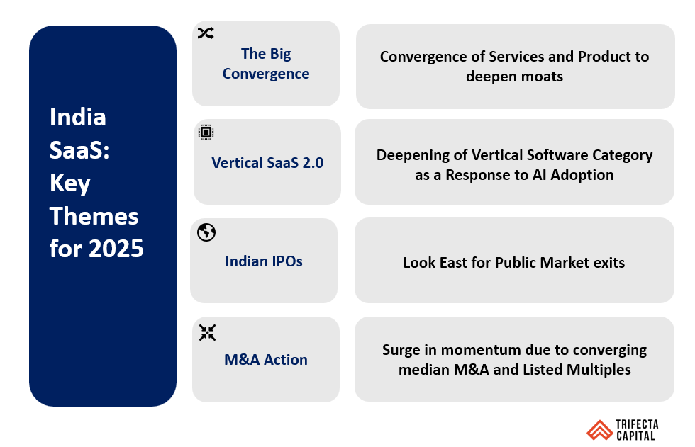 - Valuation convergence invigorates M&A activity: Even on the private markets side the recent acquisitions of greytHR and Eka Care have created renewed optimism towards strategic and PE exits. The convergence of the Median SaaS M&A multiples (went from 8x in mid-2021 to 4x in mid-2024) and public markets multiples (went from 14.4x in mid-2021 to 6x in mid-2024) is indicative of growing M&A momentum.