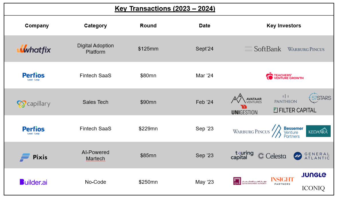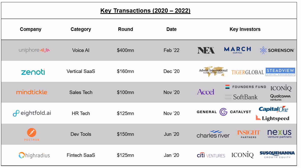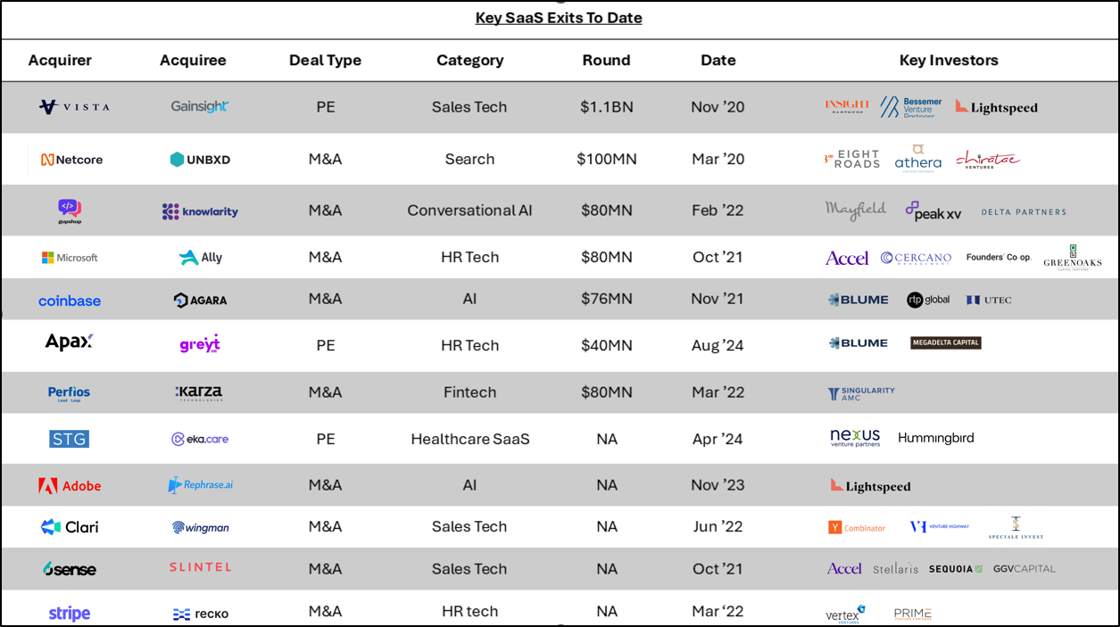 Acquisitions by strategic (PE-backed and otherwise) and private equity players have created some liquidity for investors. PE funds like Vista, STG, and Apax as well as PE-backed Strategics like Clari, and Perfios have all made notable acquisitions in the ecosystem. Strategic M&A by international companies like Adobe, Microsoft, and Stripe also attest to the quality of product innovation at these companies.