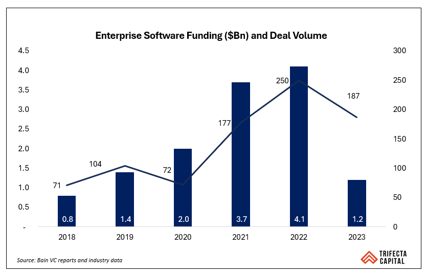Enterprise software funding in India has gone from $0.8Bn in 2018 to $1.2Bn in 2023 to over $1.4Bn in 2024. With over ten $100M ARR companies, the ecosystem has backed several investments in both horizontal and vertical software. The last 3 years have also witnessed the rise of several emerging managers, who have set up specialized funds (Boldcap, Neon Fund, Foster Ventures, Ahead VC) to strengthen the Indo-US corridor. This is also reflected in the uptick in deal volume brought on by the rise in the number of Pre-Seed, Seed, and Series A deals.